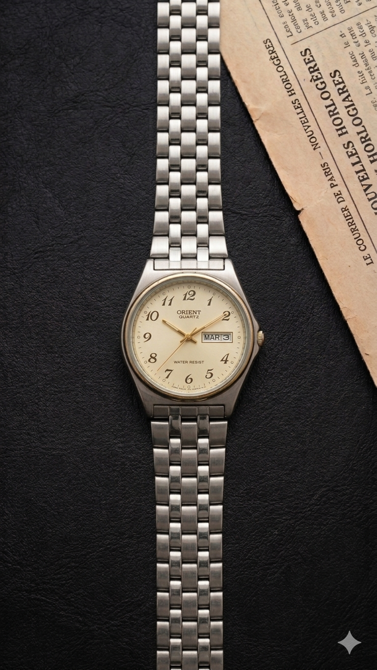 Cette montre Yema incarne l’élégance minimaliste des années vintage avec son cadran doré strié et son bracelet acier intégré.